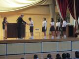 式の中で、今月上旬に児童から寄せられた13,841円の募金の目録が児童会役員から新垣会長に手渡され、新垣会長からは感謝の言葉と、赤い羽根共同募金の趣旨などについてのお話をいただきました。
