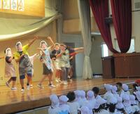 その後、2、4、5年生からそれぞれお祝いの言葉とダンスのプレゼント、6年生はダンスと1年生をマットに乗せて運ぶ「空飛ぶじゅうたん」で、1年生を楽しませるだけでなく、会場を盛り上げていました。