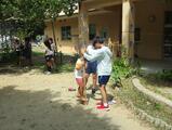 9月25日(木)、26日(金)の昼休み、園児が6月の日曜参観の際に家族とともに製作した竹馬を持って中庭に出ると、早速6年生が竹馬に乗る園児を支えたり、励ましたりする光景が見られました。